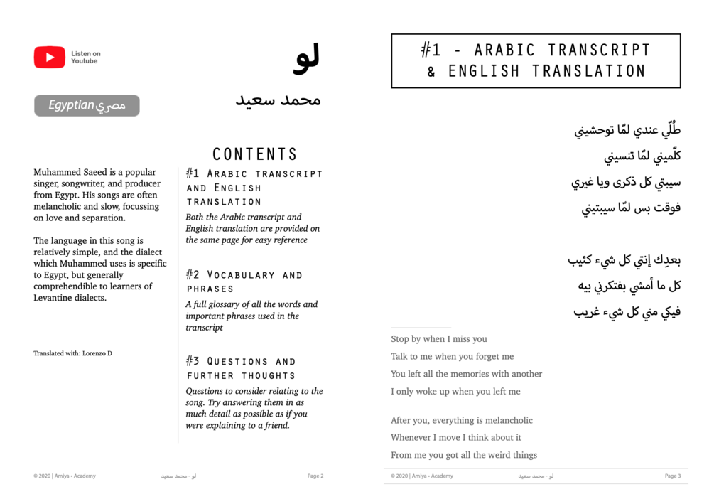The lesson is a PDF file that contains a reading guide to the song 'If' by the Egyptian artist Muhammed Saeed. The PDF contains the following: